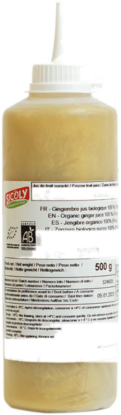 Ekologisk ingefärsjuice gjord på ekologiskt odlad ingefära från Peru. Det varma och fuktiga klimatet är idealiskt för att odla ingefära och ger en unik produkt med intensiv smak och färg, jämfört med ingefära från andra länder. Ingefärsjuicen är mycket koncentrerad och har ett naturligt sting. Den är perfekt för smaksättning till matlagning och desserter, men även till drinkar. Eftersom det är 100% ren koncentrerad juice av ingefära utan trådar passar den väldigt bra till glasstillverkning.