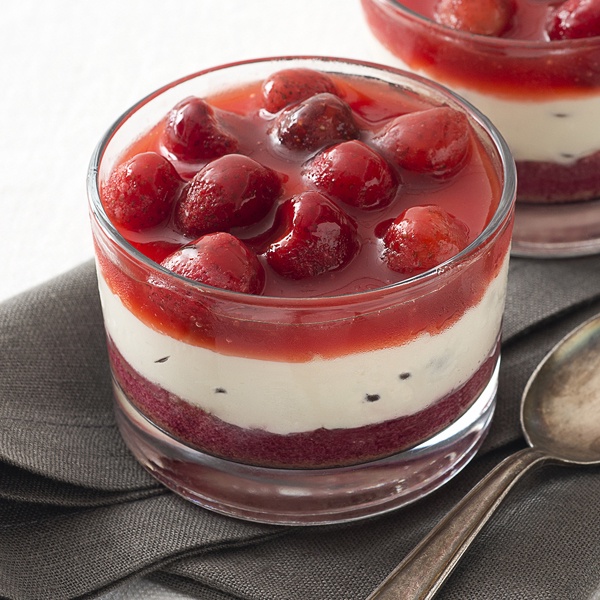 Portionsdessert i glas. Mascarponecrème med chokladbitar på sockerkaksbotten. Toppad med små jordgubbar och jordgubbssås.