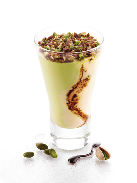 Pistage- och vaniljglass med choklad och kanderade pistagenötter i glas.