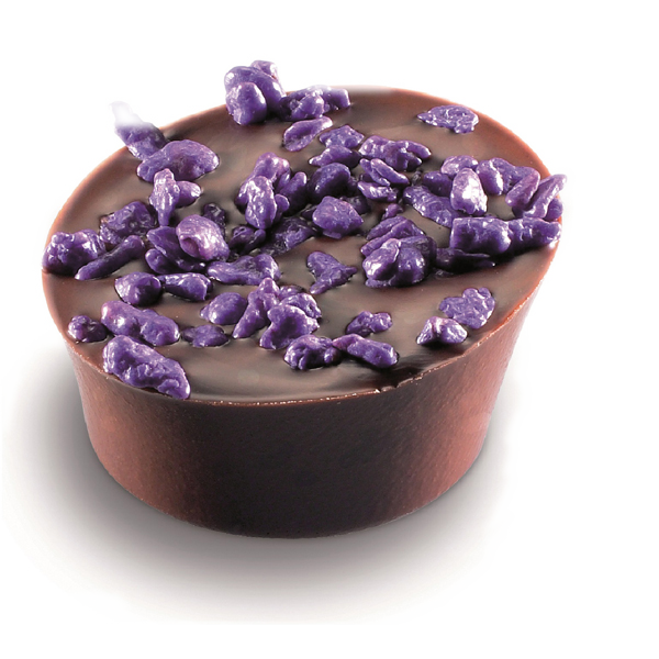 Ganache smaksatt med svarta vinbär och krusbär. Överdragen med mörk choklad och dekorerad med kanderad viol.2 kg/krt, ca 212 st, 9,4 g/st.