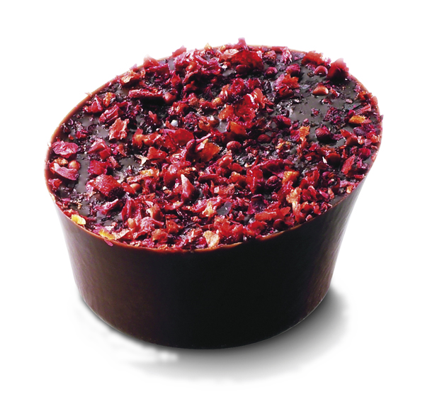 Ganache med hallon och litchi. Överdragen med mörk choklad och dekorerad med granulat av röda frukter.