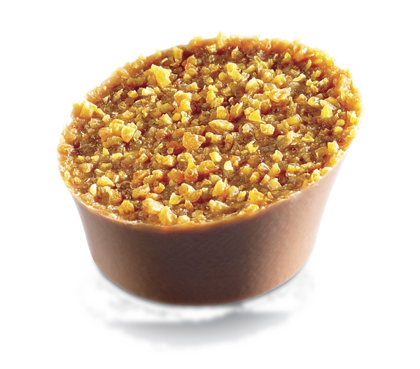 Passionsfruktsganache överdragen med mjölkchoklad. Dekorerad med granulat av gula frukter.
