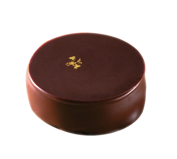 Mörk ganache gjord på Valrhonas klassiker Guanaja 70%. Överdragen med mörk choklad och dekorerad med bladguld. 2 kg/krt ca 182 st, 11 g/st.