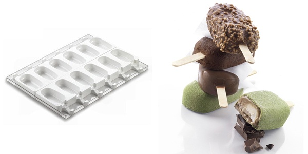 Glassform för pinnglassar med 6 stycken gjutningar per matta. Formen är tillverkad i livsmedelsgodkänt silikon och klarar temperaturer från -60°C – +230°C. Tål maskindisk och mikrovågsugn. Mått: 93×48,5×25 mm och rymmer 90 ml. Set om 2 mattor á 6 glassar och 50 glasspinnar.