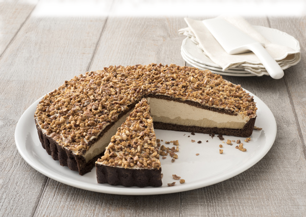 Chokladbotten fylld med hasselnötscrème, dekorerad med hackade karamelliserade hasselnötter från Piemonte.Portionsskuren tårta i 12 bitar.