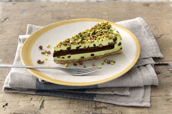Ljuvlig kaka med hasselnötsbotten, krönt med en pistagecrème och fyllning av choklad. Dekorerad med hackade pistagenötter och karamelliserade hasselnötter för en perfekt balans av smak och knaprighet.