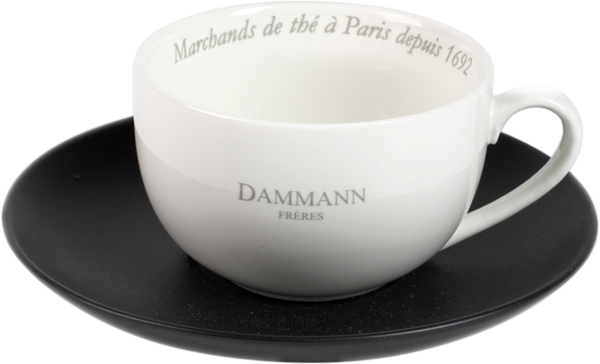 Porslinskopp med Dammann Frères logo och tillhörande fat.