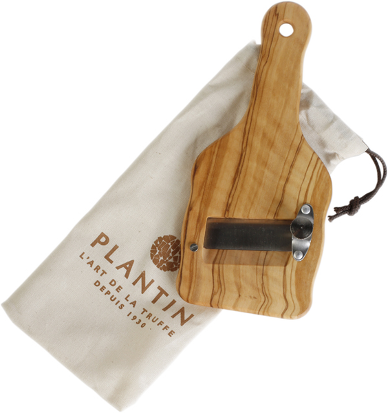 Kraftfullt tryffeljärn i trä med skarpt rostfritt knivblad. Justeringsskruv för perfekt skivning från 0,2 till 3,0 mm.