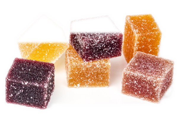 Mjuk marmeladkonfekt med en frisk, fruktig smak och ett fint lager av socker. Finns i sex olika smaker: hallon, svarta vinbär, plommon, aprikos, citron, vingårdspersika.